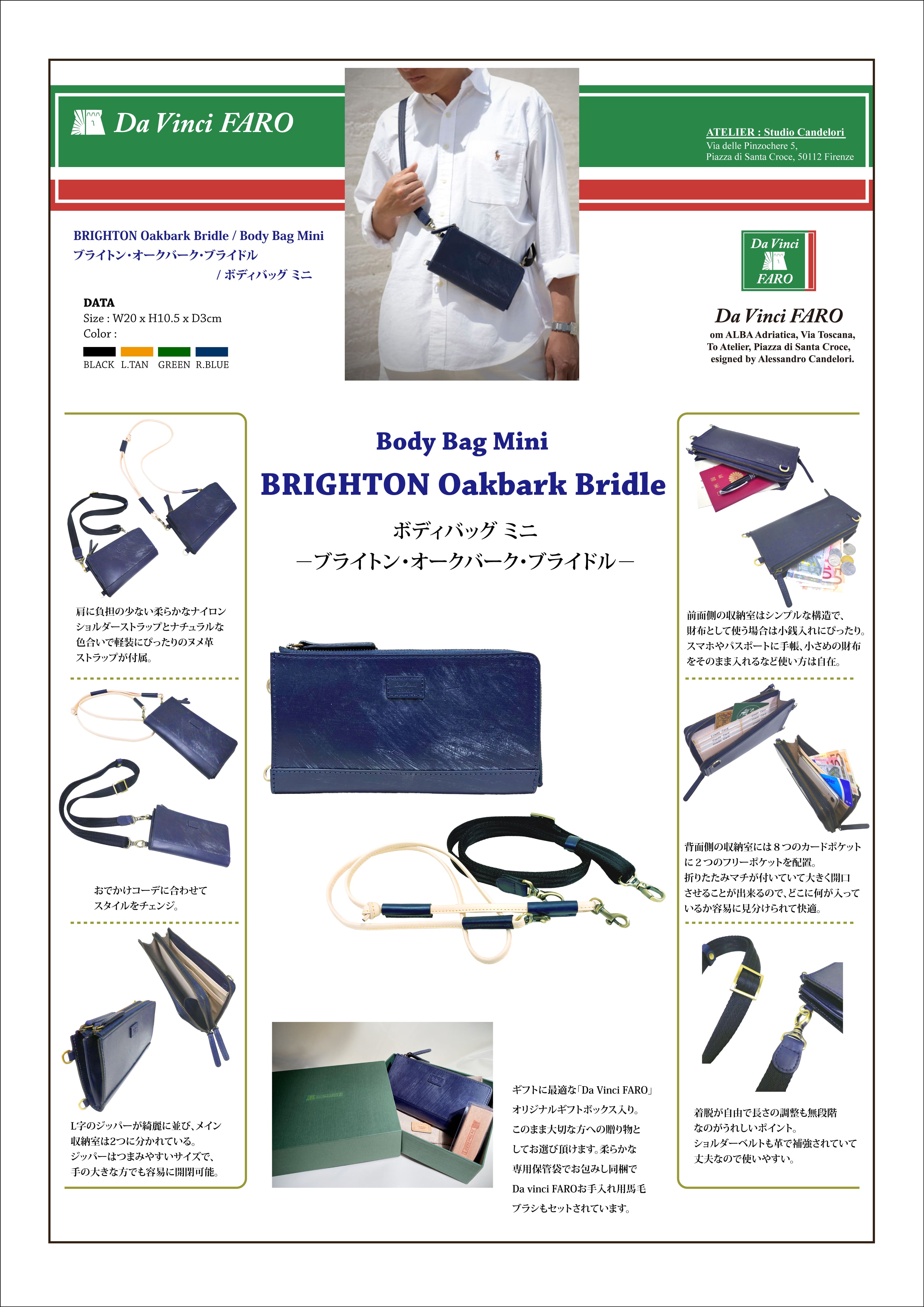 オークバークのブライドル革で仕上げられたボディバッグのミニタイプ。柔らかいナイロンベルトタイプとヌメ革の紐タイプ2種類の着脱可能なショルダーストラップで、様々なシーンに適したスタイルへ替えて大人らしさを演出。小銭、お札、カードを分けて収納することもできて財布代わりとしてもお使いいただけます。